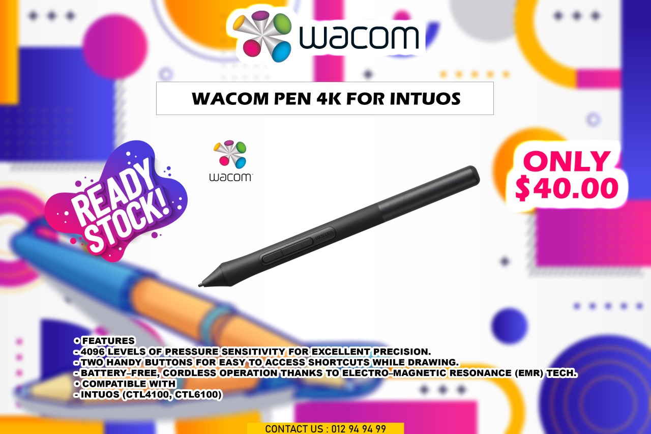 The Wacom Pen 4K Stylus is designed for use with select small and medium Wacom Intuos Creative Pen tablets. It's cordless, battery-free, and features 4096 levels of pressure sensitivity. On its side are programmable buttons that you can use to set up time-saving shortcuts.