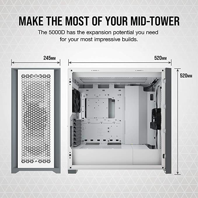 The CORSAIR 5000D AIRFLOW is a mid-tower ATX case that shows off your PC, and not its cables. An airflow-optimized front panel delivers maximum ventilation to your system, while CORSAIR RapidRoute cable management makes it simple to keep