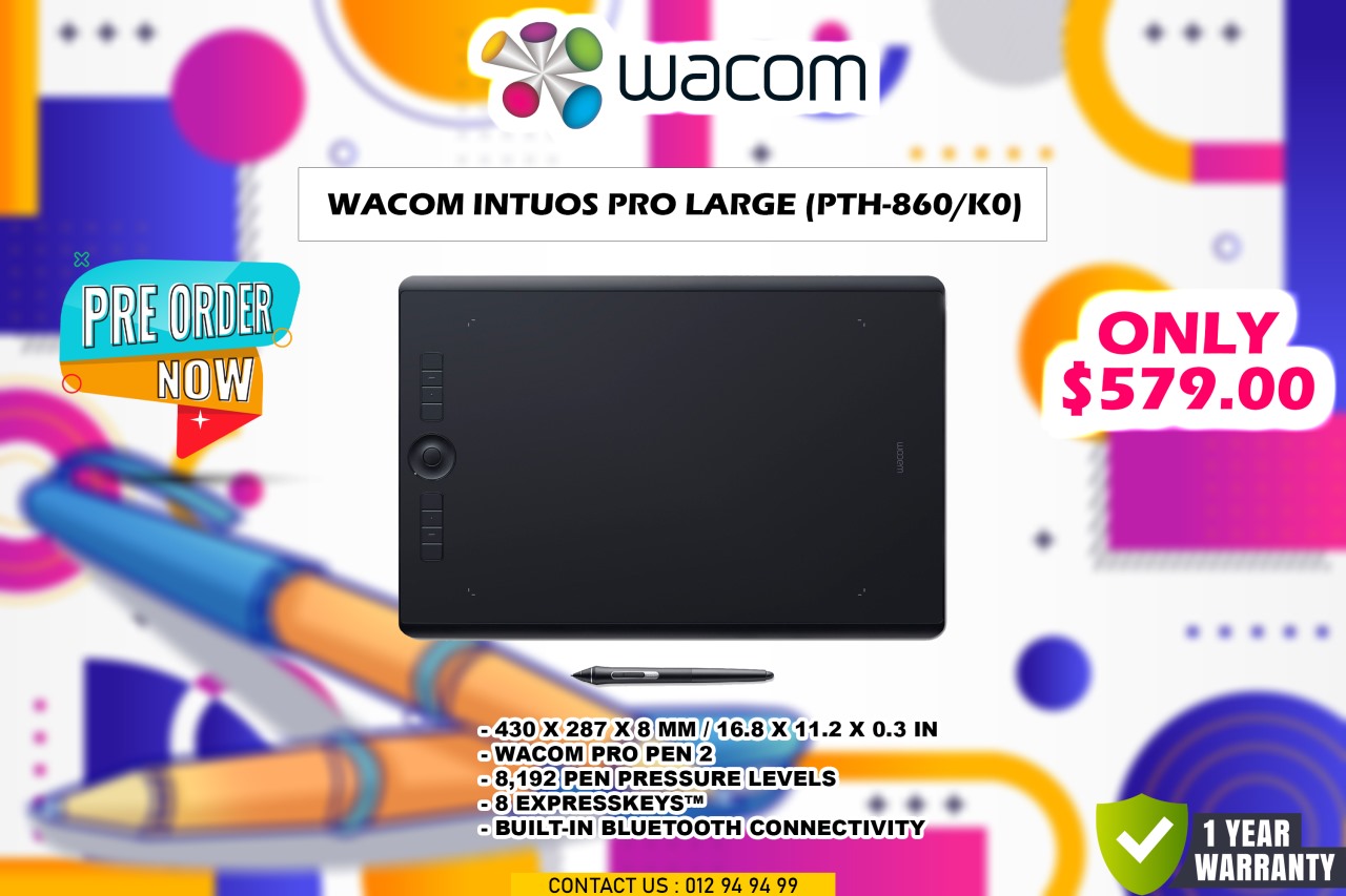 - 430 x 287 x 8 mm / 16.8 x 11.2 x 0.3 in- Wacom Pro Pen 2- 8,192 pen pressure levels- 8 ExpressKeys™- Built-in Bluetooth connectivity