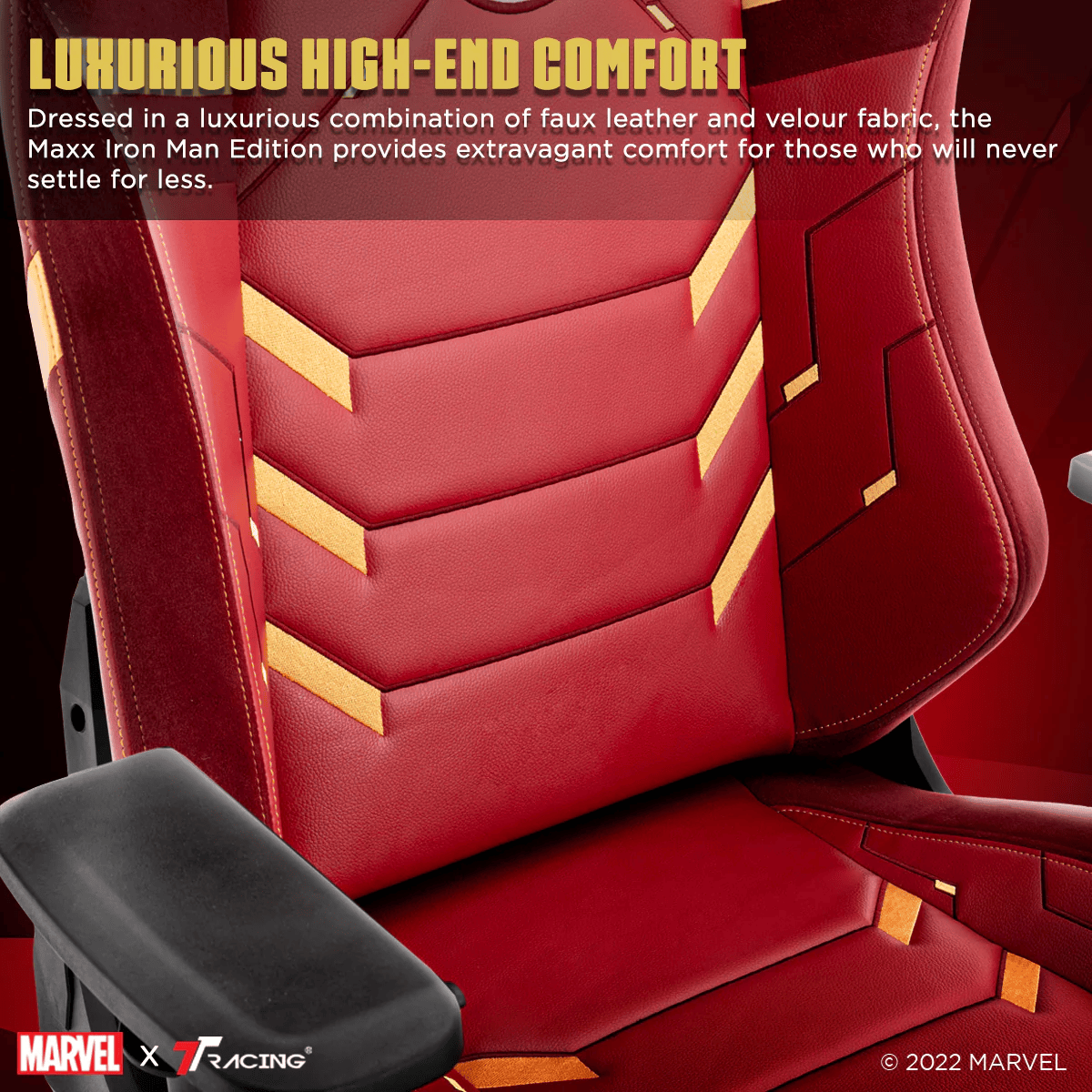 The Maxx Iron Man Edition combines the extravagant comfort experience of the Maxx chair with the trademark Iron Man armor design. Dressed in a combination of faux leather and velour fabric, the chair boasts a high-end comfort experience for those who won’t settle for less. The velour fabric also minimizes heat trap and dissipates heat faster, allowing you to work or play during any kind of weather. It’s the perfect chair for busting villainous foes for long hours.