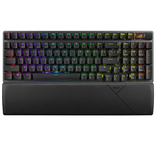 ROG Strix Scope II 96 Wireless gaming keyboard with tri-mode connection, streamer hotkeys, multifunction controls, hot-swappable pre-lubed ROG NX Snow & Storm mechanical switches, ROG keyboard stabilizers, PBT doubleshot keycaps and silicone dampening foam, three tilt angles, and wrist rest