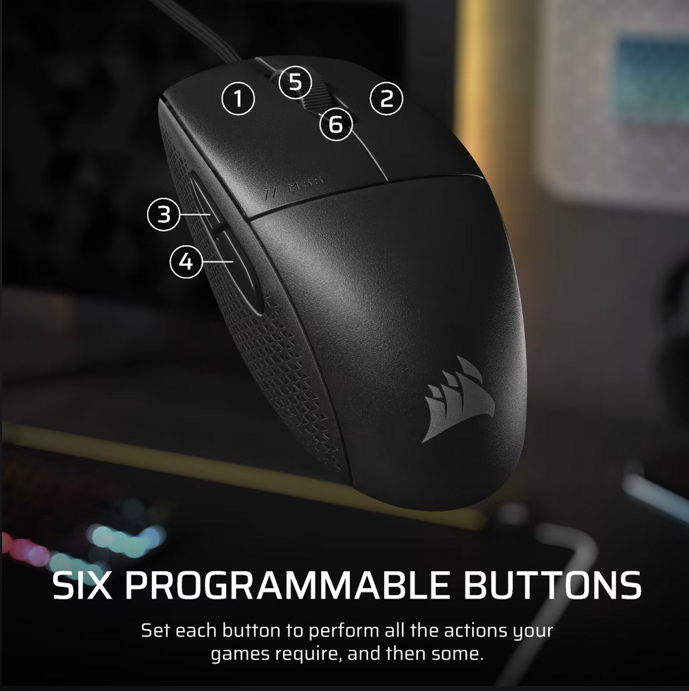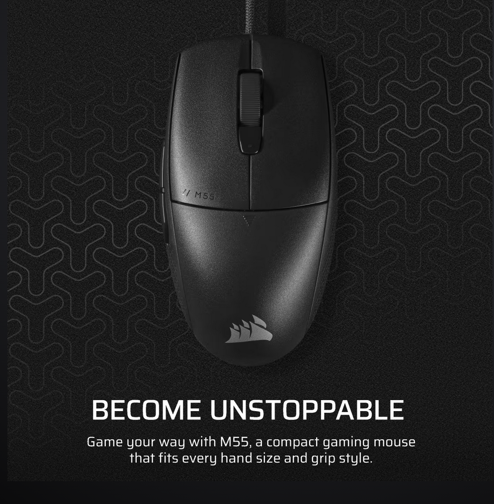 Become a truly unstoppable force. The CORSAIR M55 gaming mouse features a compact symmetrical shape to fit your hand size and grip style. At just 55g, the sleek M55 dashes across your desktop with ease, and the mouse’s optical sensor supports up to 16,000 DPI to track every sweep and stop with precision.