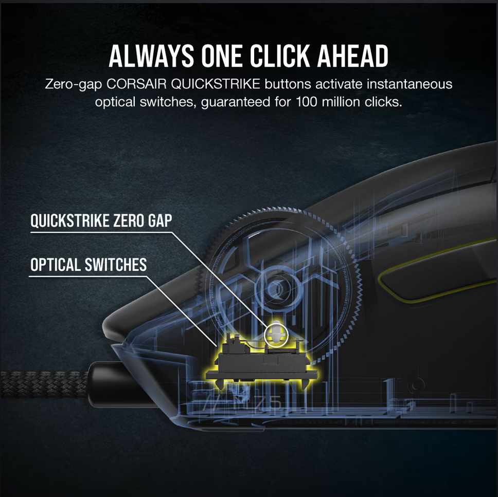 - CORSAIR QUICKSTRIKE BUTTONS: CORSAIR QUICKSTRIKE delivers zero delay between the left and right click buttons and their switches, so your shots register instantly.