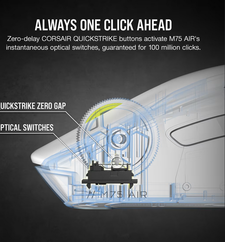 - CORSAIR QUICKSTRIKE BUTTONS: CORSAIR QUICKSTRIKE delivers zero delay between the left and right click buttons and their switches, so your shots register instantly.