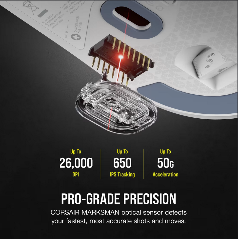 - Ultra-Precise 26k DPI Optical Sensor: With a native 26,000 DPI, 650 IPS tracking, and up to 50G acceleration, the CORSAIR MARKSMAN optical sensor accurately captures fast-twitch mouse movements, speedy sweeps, and rapid recenters.
