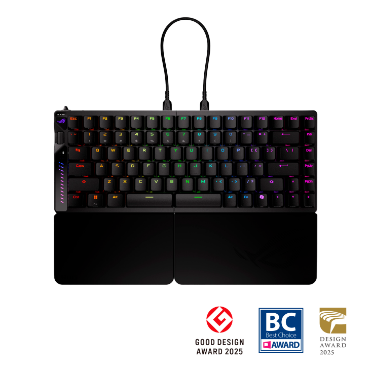 ROG Falcata 75% split gaming keyboard with hot-swappable ROG HFX V2 Magnetic Switches and ROG Hall Sensor; featuring Rapid Trigger toggle, intuitive control and multi-function wheel, tri-mode connectivity with ROG SpeedNova 8K wireless technology, Zone Mode, four-layer dampening and detachable silicone wrist rests