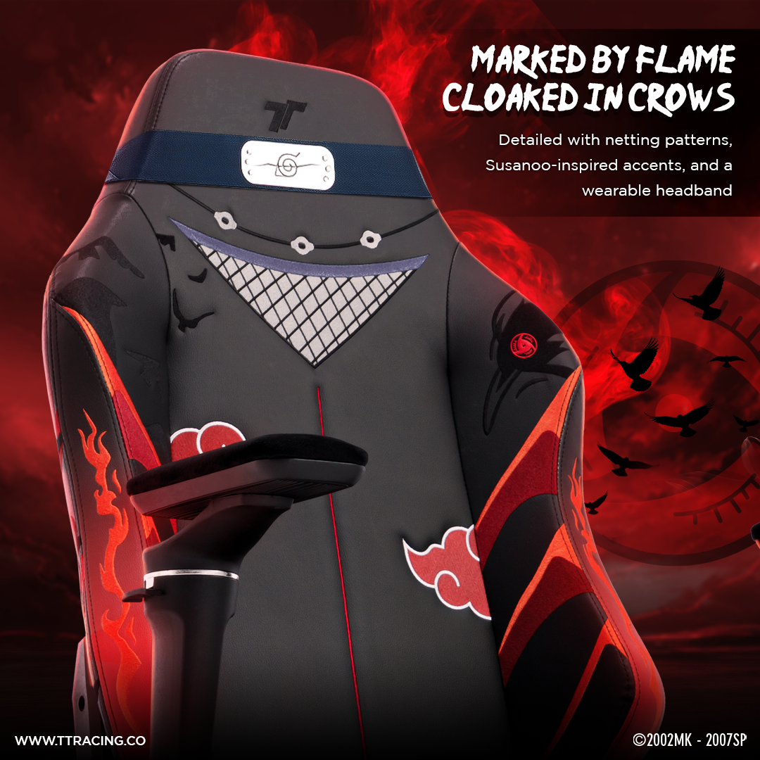 The TTRacing Maxx - Itachi Edition tells a tale of silent strength and purpose with detailed textures and crimson accents. Crow motifs and the Mangekyo Sharingan seal the presence of his legacy.