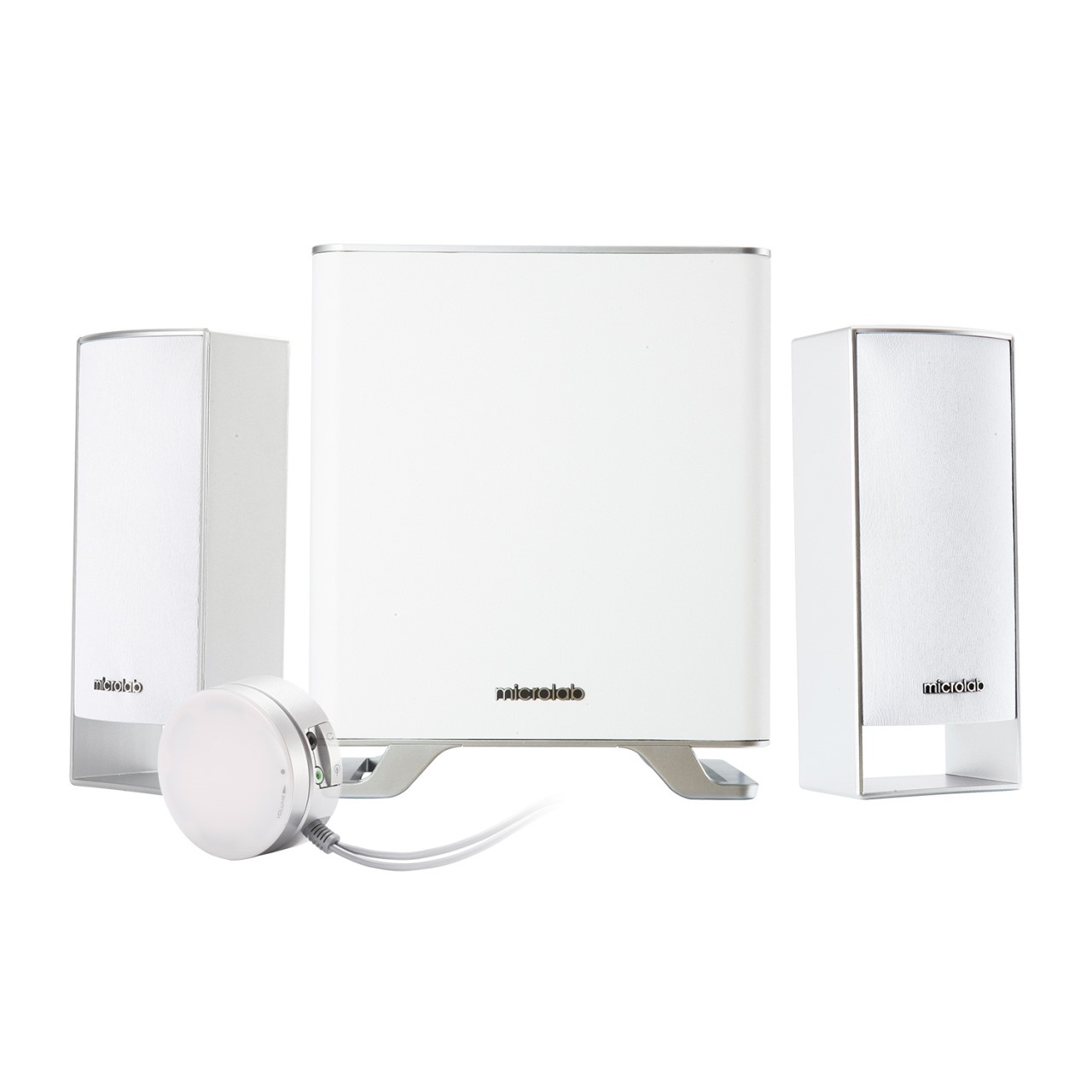 M-600BT is a 2.1 multimedia speaker system with Bluetooth, easily connecting to your phones and Bluetooth enabled devices. The wooden subwoofer covered with snow white leather finishes and the satellites are designed with cloth net.